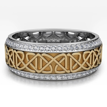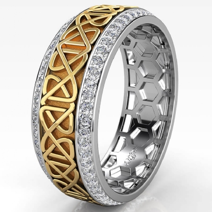 Vintage artwork celtic design round diamond eternity men's wedding band handcrafted in 18k Gold 2Tone. This comfort-fit high-quality ring features celtic design along the center in yellow gold with round diamonds in a micro pave setting on edges in white gold. Also available in 14k & 18k white gold, yellow gold, rose gold, two-tone gold and platinum 950. If you don't find your desired jewelry, please don't hesitate to contact our designer to make your custom jewelry design. (1Ct. tw.)