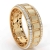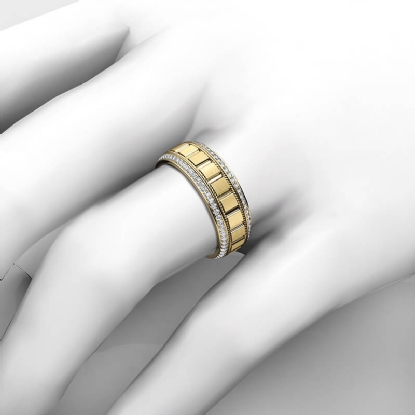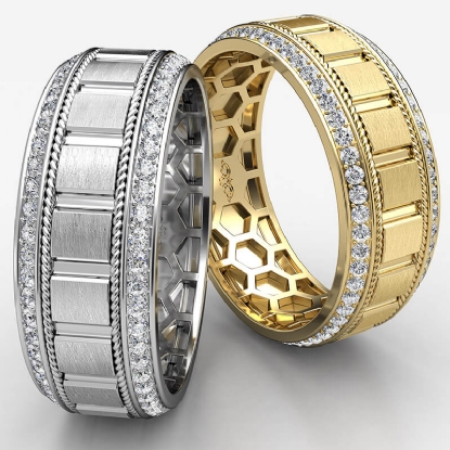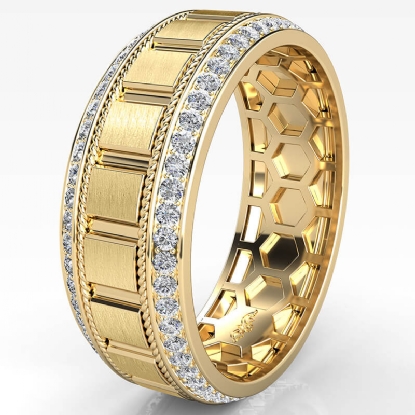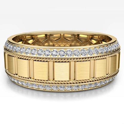 This luxurious designer matte finish round diamond eternity men's wedding band made in 14k Gold Yellow. Features vertical cuts along the center in yellow gold and rope on sides of the ring in white gold with round diamonds in a micro pave setting on beveled edges. This beautiful ring combines matte and high polished finishes for a stylish look, Also available in 14k & 18k white gold, yellow gold, rose gold, two-tone gold and platinum 950. If you don't find your desired jewelry, please don't hesitate to contact our designer to make your custom jewelry design. (0.9Ct. tw.)
