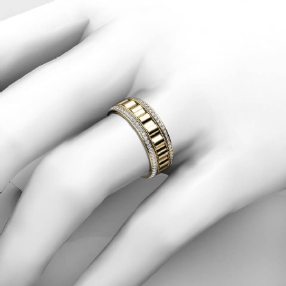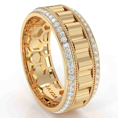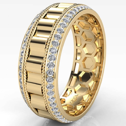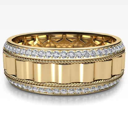 This classic designer rope edge round diamond eternity men's wedding band crafted in 14k Gold Yellow. Features polished finish luxurious pattern along the center in yellow gold and rope on sides of the ring in white gold with round diamonds in a micro pave setting on beveled edges. Also available in 14k & 18k white gold, yellow gold, rose gold, two-tone gold and platinum 950. If you don't find your desired jewelry, please don't hesitate to contact our designer to make your custom jewelry design. (0.9Ct. tw.)