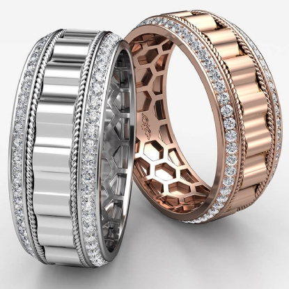 This classic designer rope edge round diamond eternity men's wedding band crafted in 14k Rose Gold. Features polished finish luxurious pattern along the center in yellow gold and rope on sides of the ring in white gold with round diamonds in a micro pave setting on beveled edges. Also available in 14k & 18k white gold, yellow gold, rose gold, two-tone gold and platinum 950. If you don't find your desired jewelry, please don't hesitate to contact our designer to make your custom jewelry design. (0.9Ct. tw.)