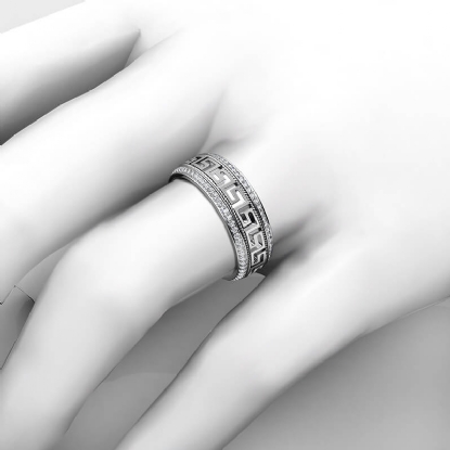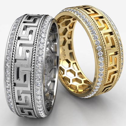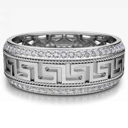 Striking greek key design round diamond eternity men's wedding band made in 14k Gold White. This elegant and stylish ring features greek key design along the center in a matte finish yellow gold and polished rope in white gold on edges, with round diamonds in a micro pave setting. Also available in 14k & 18k white gold, yellow gold, rose gold, two-tone gold and platinum 950. If you don't find your desired jewelry, please don't hesitate to contact our designer to make your custom jewelry design. (0.9Ct. tw.)