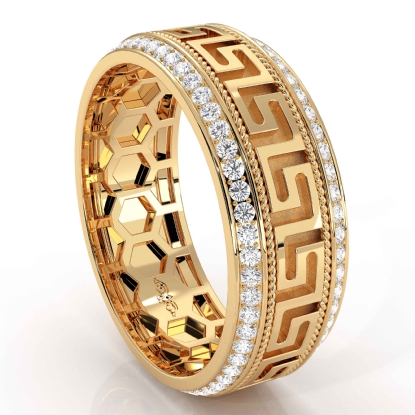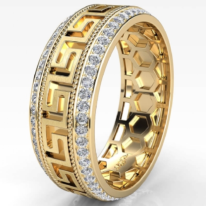 Striking greek key design round diamond eternity men's wedding band made in 14k Gold Yellow. This elegant and stylish ring features greek key design along the center in a matte finish yellow gold and polished rope in white gold on edges, with round diamonds in a micro pave setting. Also available in 14k & 18k white gold, yellow gold, rose gold, two-tone gold and platinum 950. If you don't find your desired jewelry, please don't hesitate to contact our designer to make your custom jewelry design. (0.9Ct. tw.)