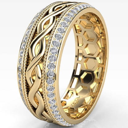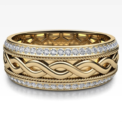 A symbol of love that will last forever, this infinity pattern round diamond eternity men's wedding band made in 14k Gold Yellow. Features an endless infinity pattern along the center in yellow gold and rope on edges in white gold, with round diamonds in a micro pave setting. Also available in 14k & 18k white gold, yellow gold, rose gold, two-tone gold and platinum 950. If you don't find your desired jewelry, please don't hesitate to contact our designer to make your custom jewelry design. (0.9Ct. tw.)