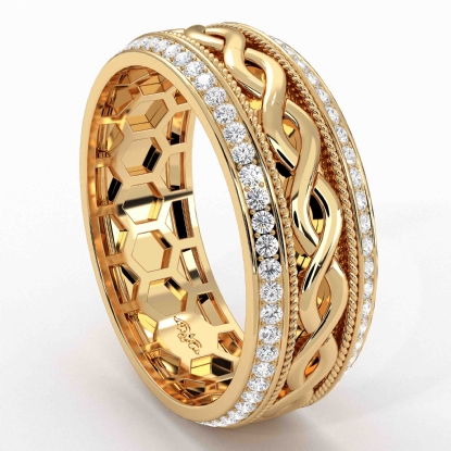 A symbol of love that will last forever, this infinity pattern round diamond eternity men's wedding band made in 18k Gold Yellow. Features an endless infinity pattern along the center in yellow gold and rope on edges in white gold, with round diamonds in a micro pave setting. Also available in 14k & 18k white gold, yellow gold, rose gold, two-tone gold and platinum 950. If you don't find your desired jewelry, please don't hesitate to contact our designer to make your custom jewelry design. (0.9Ct. tw.)