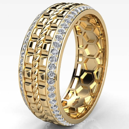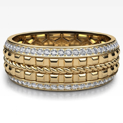This striking designer center rope round diamond eternity men's wedding band handmade in 18k Gold Yellow. Features rope along the center in white gold and gold bar pattern on sides of the ring in yellow gold, with round diamonds in a micro-pave setting on edges. Also available in 14k & 18k white gold, yellow gold, rose gold, two-tone gold and platinum 950. If you don't find your desired jewelry, please don't hesitate to contact our designer to make your custom jewelry design. (1.25Ct. tw.)