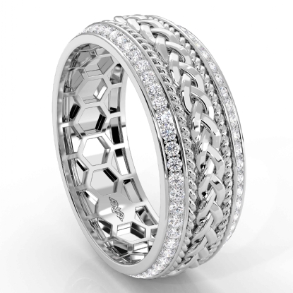 This beautifully polished rope braided beveled edge round diamond eternity men's wedding band made in 14k Gold White. Features polished finish braided rope along the center in yellow, white, and rose gold with brilliant round diamonds in a micro pave setting on beveled edges. Also available in 14k & 18k white gold, yellow gold, rose gold, trio color gold and platinum 950. If you don't find your desired jewelry, please don't hesitate to contact our designer to make your custom jewelry design. (0.9Ct. tw.)