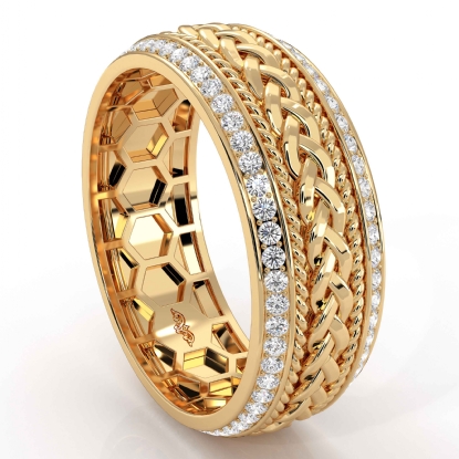 This beautifully polished rope braided beveled edge round diamond eternity men's wedding band made in 14k Gold Yellow. Features polished finish braided rope along the center in yellow, white, and rose gold with brilliant round diamonds in a micro pave setting on beveled edges. Also available in 14k & 18k white gold, yellow gold, rose gold, trio color gold and platinum 950. If you don't find your desired jewelry, please don't hesitate to contact our designer to make your custom jewelry design. (0.9Ct. tw.)