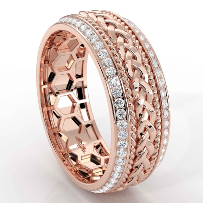 This beautifully polished rope braided beveled edge round diamond eternity men's wedding band made in 14k Rose Gold. Features polished finish braided rope along the center in yellow, white, and rose gold with brilliant round diamonds in a micro pave setting on beveled edges. Also available in 14k & 18k white gold, yellow gold, rose gold, trio color gold and platinum 950. If you don't find your desired jewelry, please don't hesitate to contact our designer to make your custom jewelry design. (0.9Ct. tw.)