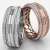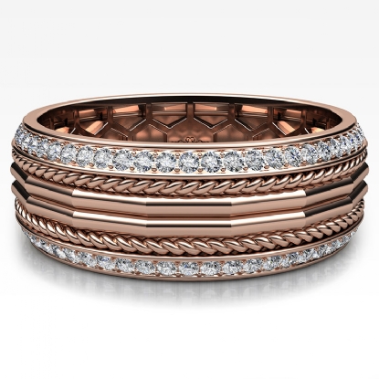 Designer comfort fit parallel line rope edge round diamond eternity men's wedding band crafted in 14k Rose Gold. This unique style ring features polished finish parallel line along the center in white gold with yellow gold rope on edges and round diamonds in a micro pave setting on the beveled edges. Also available in 14k & 18k white gold, yellow gold, rose gold, two-tone gold and platinum 950. If you don't find your desired jewelry, please don't hesitate to contact our designer to make your custom jewelry design. (0.9Ct. tw.)
