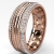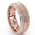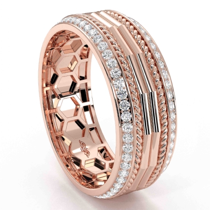 Designer comfort fit parallel line rope edge round diamond eternity men's wedding band crafted in 18k Rose Gold. This unique style ring features polished finish parallel line along the center in white gold with yellow gold rope on edges and round diamonds in a micro pave setting on the beveled edges. Also available in 14k & 18k white gold, yellow gold, rose gold, two-tone gold and platinum 950. If you don't find your desired jewelry, please don't hesitate to contact our designer to make your custom jewelry design. (0.9Ct. tw.)