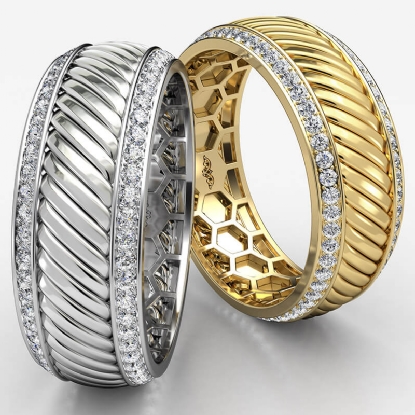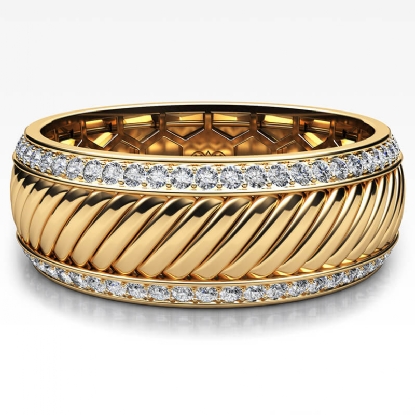 Highly polished candy cane design round diamond eternity men's wedding band handmade in 18k Gold Yellow. This comfort fit wedding ring features polished finish candy can design along the center with round diamonds in a micro pave setting on the edges. Also available in 14k & 18k white gold, yellow gold, rose gold and platinum 950. If you don't find your desired jewelry, please don't hesitate to contact our designer to make your custom jewelry design. (0.9Ct. tw.)