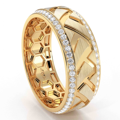This elegant zig-zag center design round diamond eternity men's wedding band beautifully carved in 14k Gold Yellow. Features matte finish zig-zag design along the center with round diamonds in a micro pave setting on the edges. Also available in 14k & 18k white gold, yellow gold, rose gold, and platinum 950. If you don't find your desired jewelry, please don't hesitate to contact our designer to make your custom jewelry design. (0.9Ct. tw.)
