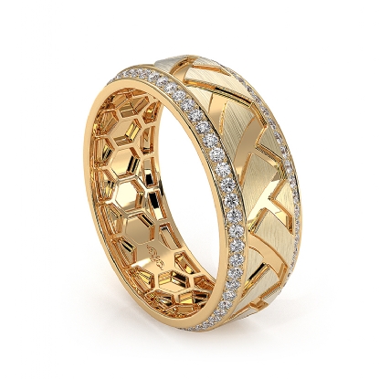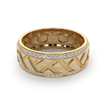 This elegant zig-zag center design round diamond eternity men's wedding band beautifully carved in 18k Gold Yellow. Features matte finish zig-zag design along the center with round diamonds in a micro pave setting on the edges. Also available in 14k & 18k white gold, yellow gold, rose gold, and platinum 950. If you don't find your desired jewelry, please don't hesitate to contact our designer to make your custom jewelry design. (0.9Ct. tw.)