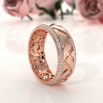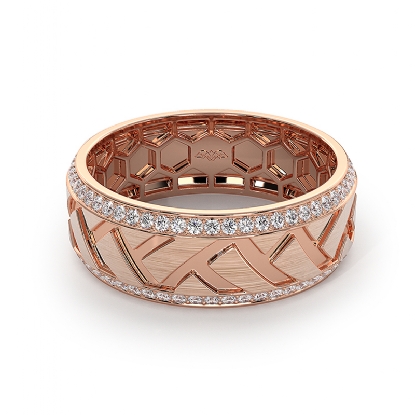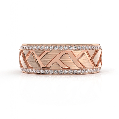 This elegant zig-zag center design round diamond eternity men's wedding band beautifully carved in 14k Rose Gold. Features matte finish zig-zag design along the center with round diamonds in a micro pave setting on the edges. Also available in 14k & 18k white gold, yellow gold, rose gold, and platinum 950. If you don't find your desired jewelry, please don't hesitate to contact our designer to make your custom jewelry design. (0.9Ct. tw.)