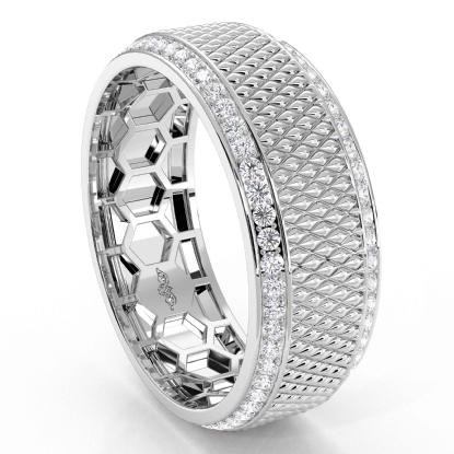 Diamond cut style carved round diamond eternity men's wedding band crafted in 18k Gold White. This classic ring features a high polished diamond cut design along the center with round diamonds in a micro pave setting on the edges. Also available in 14k & 18k white gold, yellow gold, rose gold, and platinum 950. If you don't find your desired jewelry, please don't hesitate to contact our designer to make your custom jewelry design. (0.9Ct. tw.)