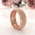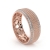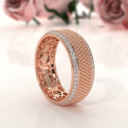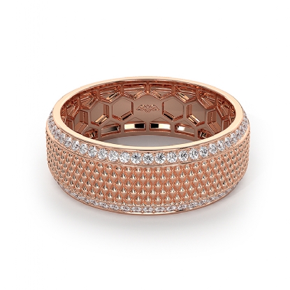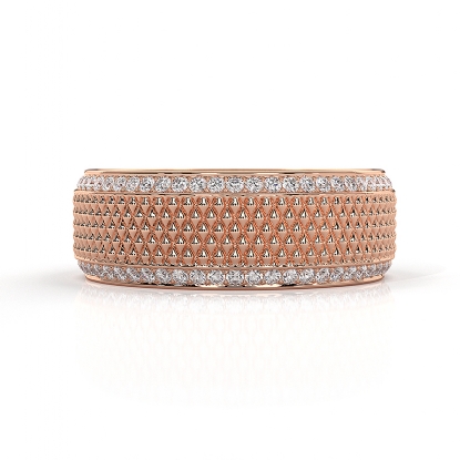 Diamond cut style carved round diamond eternity men's wedding band crafted in 18k Rose Gold. This classic ring features a high polished diamond cut design along the center with round diamonds in a micro pave setting on the edges. Also available in 14k & 18k white gold, yellow gold, rose gold, and platinum 950. If you don't find your desired jewelry, please don't hesitate to contact our designer to make your custom jewelry design. (0.9Ct. tw.)
