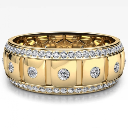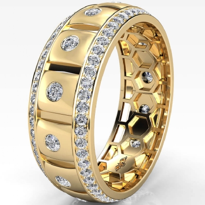 This comfort-fit bezel round diamond eternity men's wedding band handmade in 18k Gold Yellow. Features round diamonds in a bezel setting and
