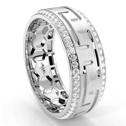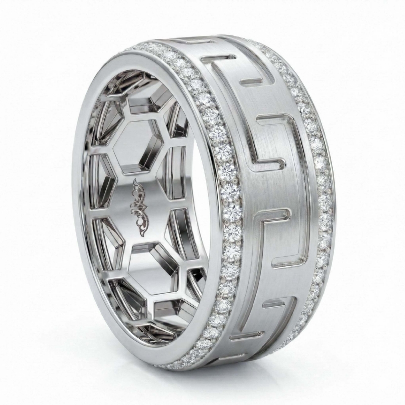 This beautifully designed matte finish greek key pattern round diamond eternity men's wedding band made in . Features matte finish greek key pattern along the center and 18k Gold White round diamonds in a micro pave setting on the edges with honeycomb design inside the ring. Also available in 14k & 18k white gold, yellow gold, rose gold and platinum 950. If you don't find your desired jewelry, please don't hesitate to contact our designer to make your custom jewelry design. (0.9Ct. tw.)