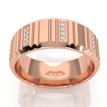 This comfort-fit wide vertical cuts round diamond eternity men's wedding band handcrafted in high quality 14k Rose Gold. Features polished finish vertical cuts and the row of round diamonds in a micro pave setting compliment the ring. Also available in 14k & 18k white gold, yellow gold, rose gold, and platinum 950. If you don't find your desired jewelry, please don't hesitate to contact our designer to make your custom jewelry design. (0.25Ct. tw.)
