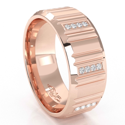 This comfort-fit wide vertical cuts round diamond eternity men's wedding band handcrafted in high quality 18k Rose Gold. Features polished finish vertical cuts and the row of round diamonds in a micro pave setting compliment the ring. Also available in 14k & 18k white gold, yellow gold, rose gold, and platinum 950. If you don't find your desired jewelry, please don't hesitate to contact our designer to make your custom jewelry design. (0.25Ct. tw.)