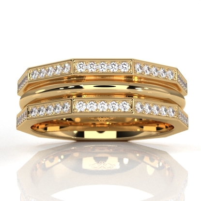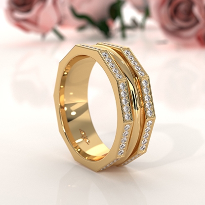 This handmade unique hexagonal style round diamond eternity men's wedding band made in 18k Gold Yellow. Features hexagonal sides with round diamonds in a micro pave setting and polished finish center dome. This comfort-fit anniversary ring also available in 14k & 18k white gold, yellow gold, rose gold, and platinum 950. If you don't find your desired jewelry, please don't hesitate to contact our designer to make your custom jewelry design. (0.8Ct. tw.)