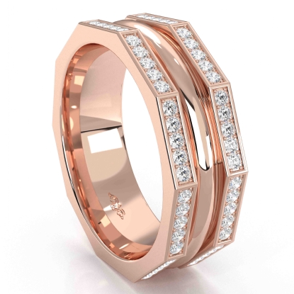 This handmade unique hexagonal style round diamond eternity men's wedding band made in 18k Rose Gold. Features hexagonal sides with round diamonds in a micro pave setting and polished finish center dome. This comfort-fit anniversary ring also available in 14k & 18k white gold, yellow gold, rose gold, and platinum 950. If you don't find your desired jewelry, please don't hesitate to contact our designer to make your custom jewelry design. (0.8Ct. tw.)