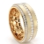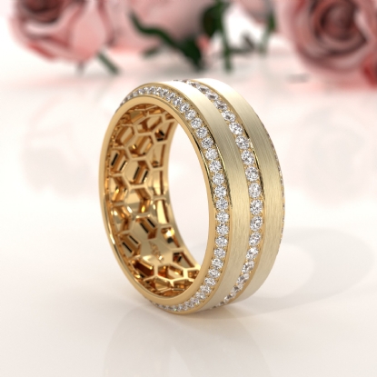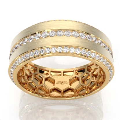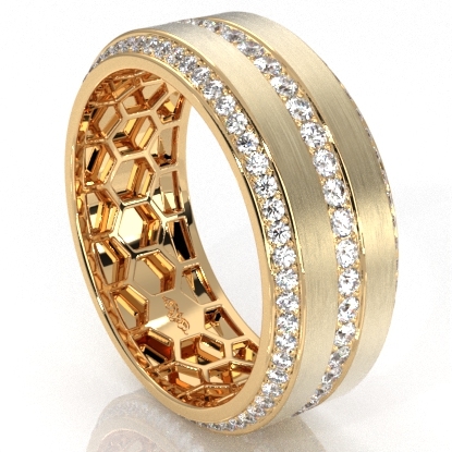 Present him on your wedding day this elegant matte finish 3 row round diamond eternity men's wedding band made in 18k Gold Yellow. This luxurious ring features a matte finish center with round diamonds in a micro pave setting on the edges and center showcases honeycomb design inside the ring. Also available in 14k & 18k white gold, yellow gold, rose gold, and platinum 950. If you don't find your desired jewelry, please don't hesitate to contact our designer to make your custom jewelry design. (1.7Ct. tw.)