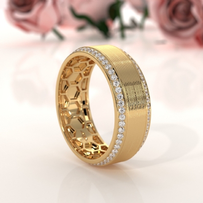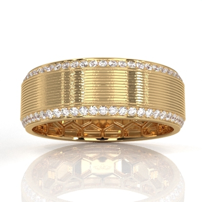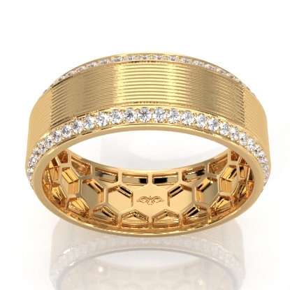This classic and stylish polished finish center grooved round diamond eternity men's wedding band crafted in high quality 18k Gold Yellow. Features polished finish center grooved with round diamonds in a micro pave setting on edges and showcases honeycomb design inside the ring. Also available in 14k & 18k white gold, yellow gold, rose gold and platinum 950. If you don't find your desired jewelry, please don't hesitate to contact our designer to make your custom jewelry design. (1.2Ct. tw.)
