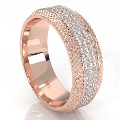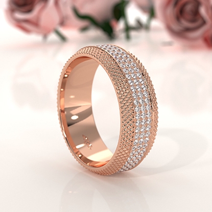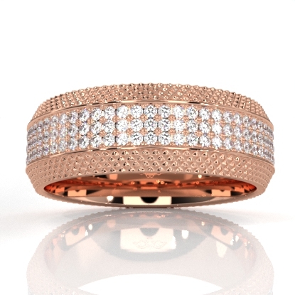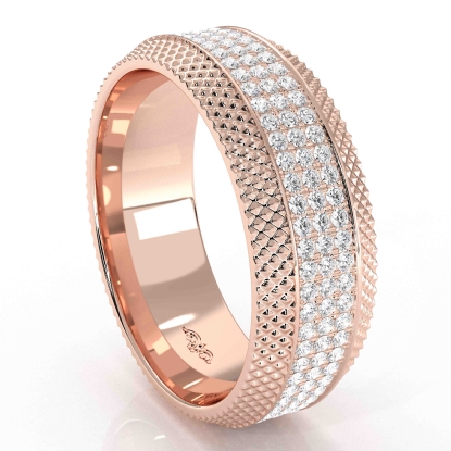 This latest design comfort fit diamond cut men's eternity wedding band crafted in high quality 18k Rose Gold. Features round diamonds in a micro pave setting with stunning diamond cuts on edges, gift this to the man you love. This luxurious ring is also available in 14k & 18k white gold, yellow gold, rose gold, and platinum 950. If you don't find your desired jewelry, please don't hesitate to contact our designer to make your custom jewelry design. (1.2Ct. tw.)