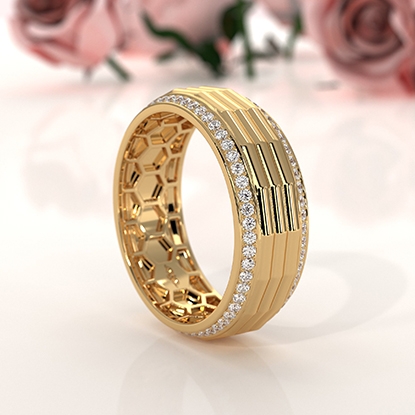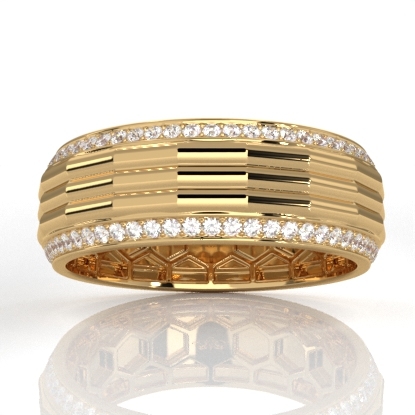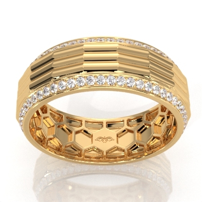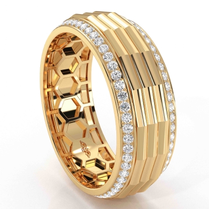 Unique style octagon grooved round diamond eternity men's wedding band handcrafted in 18k Gold Yellow. Luxury with style, this classic ring features polished finish octagon grooved center with round diamonds in a micro pave setting on the edges with honeycomb design inside the ring. Also available in 14k & 18k white gold, yellow gold, rose gold, two-tone gold and platinum 950. If you don't find your desired jewelry, please don't hesitate to contact our designer to make your custom jewelry design. (0.9Ct. tw.)