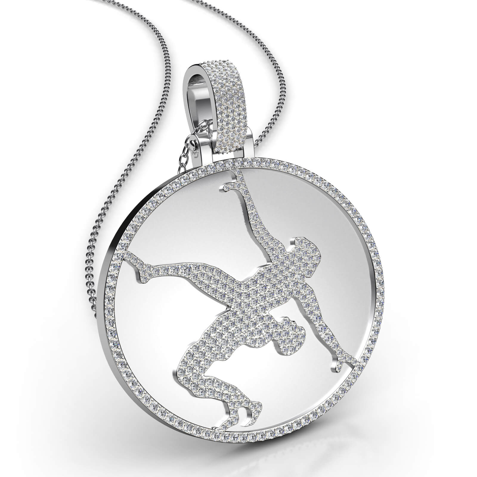This custom glamorous couple diamond pendant handcrafted in 18k Gold White. Elegant circle diamond pendant showcases diamonds surrounding pendant with couple along the center secured with diamond bail and 18 inches rolo chain. If you don't find your desired jewelry, please don't hesitate to contact our designer to make your custom jewelry design (4Ct. tw.)