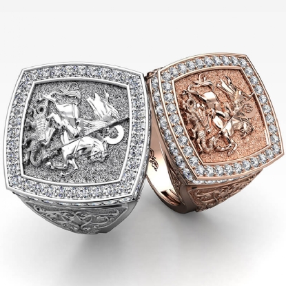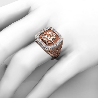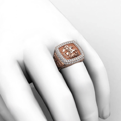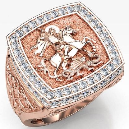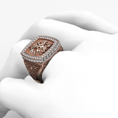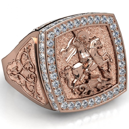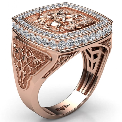 Bold & unique style men's signet sovereign diamond ring skillfully crafted in 14k Rose Gold. This iconic ring showcasing the artwork of Saint George slaying the dragon, features brilliant round diamonds on halo in a micro pave setting and a beautiful design on shank. Also available in 14k & 18k white gold, yellow gold, rose gold and platinum 950. If you don't find your desired jewelry, please don't hesitate to contact our designer to make your custom jewelry design (1.9Ct. tw.)