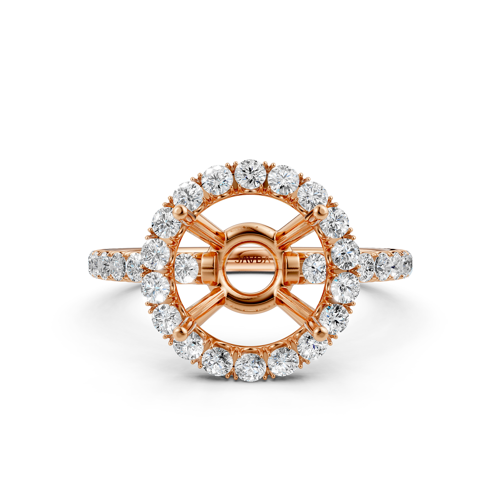 Adorn your outfit with this dazzling halo diamond engagement ring setting handcrafted in 14k Rose Gold. This beautiful ring showcases a round semi mount encircled with diamonds in a french U split pave setting on halo and shank. Also available in 14k & 18k white gold, yellow gold, rose gold and platinum 950. If you don't find your desired jewelry, please don't hesitate to contact our designer to make your custom jewelry design (1Ct. tw.)