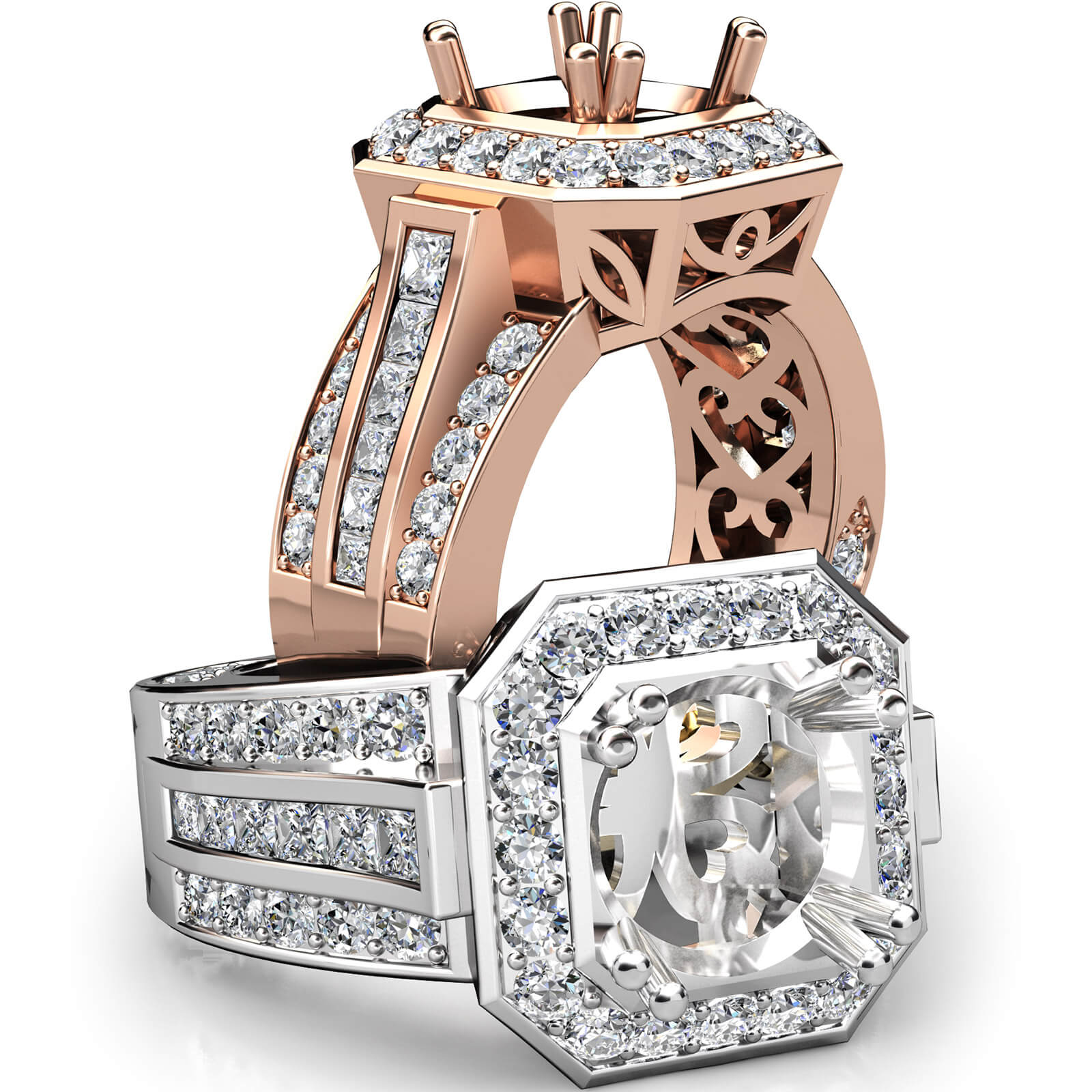 Made in 18k Rose Gold & vintage in design, this women's diamond engagement ring showcases a semi-mount halo of round pave-set diamonds, along with princess diamonds in channel setting on the shank. (1.65Ct. tw.)
