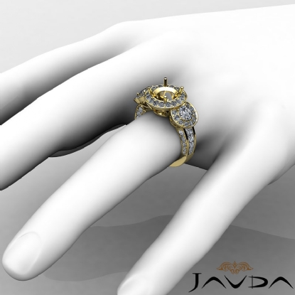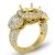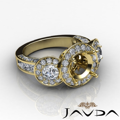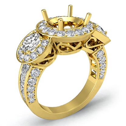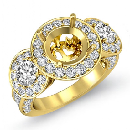 Triple the diamonds for limitless shine! This 18k Gold Yellow & semi mount engagement ring features round halo diamonds that frame the three round stones, along with pave set diamonds on the shank. (1.3Ct. tw.)