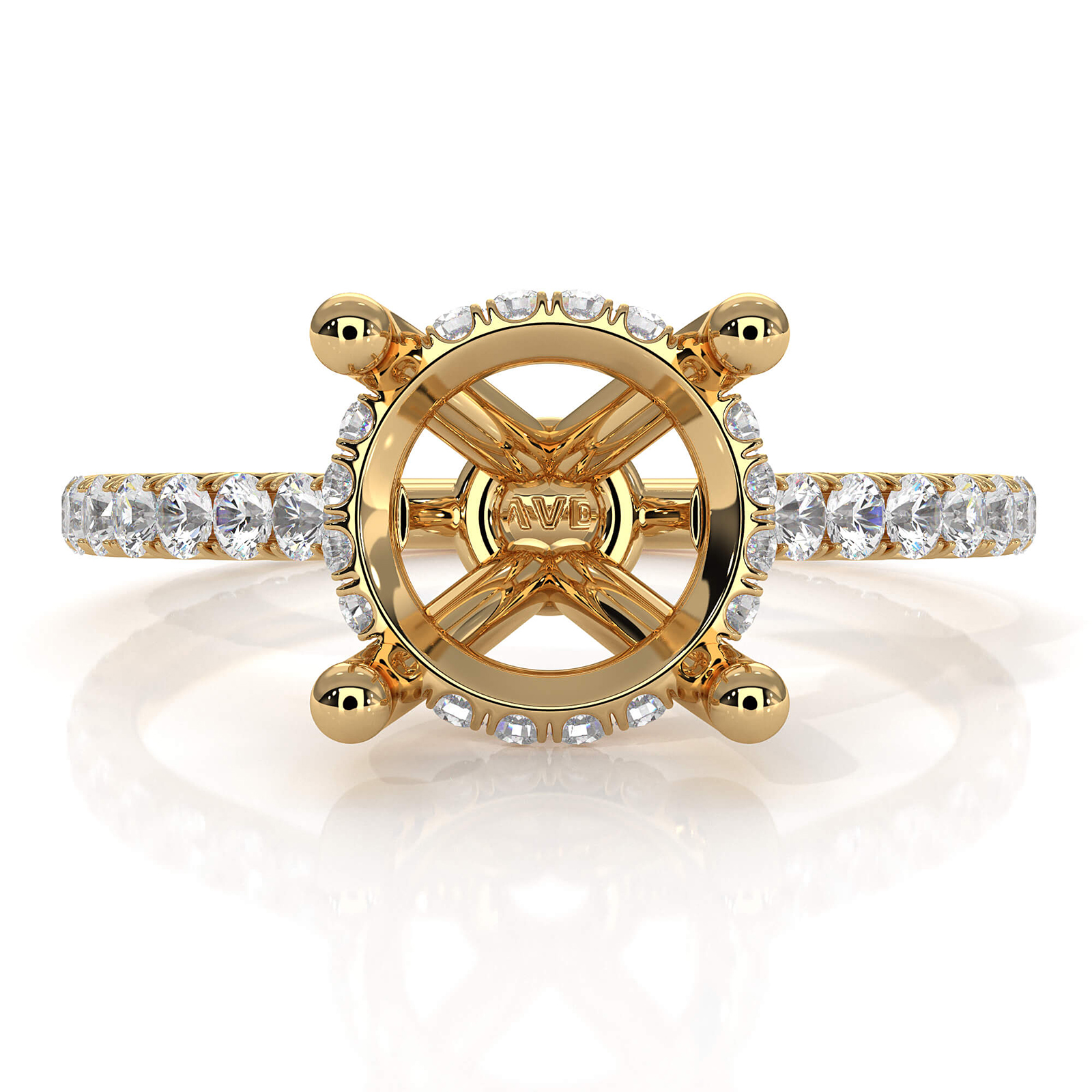 An elegant hidden halo round semi mount diamond engagement ring crafted in 18k Gold Yellow. This dazzling ring showcases round diamonds in a french U cut pave setting on halo and a cathedral shank. Also available in 14k & 18k white gold, yellow gold, rose gold and platinum 950. If you don't find your desired jewelry, please don't hesitate to contact our designer to make your custom jewelry design (0.47Ct. tw.)
