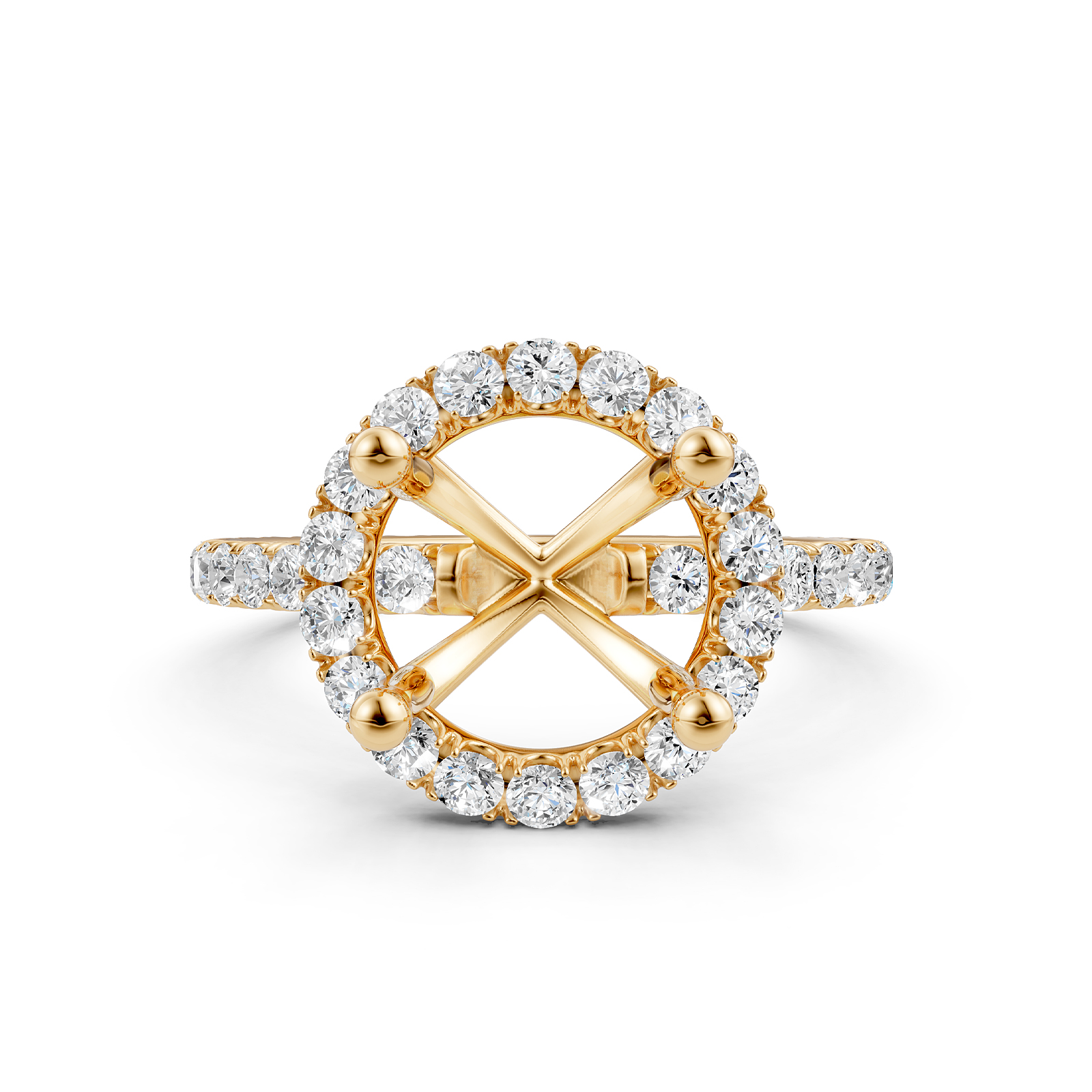 Add a flair of sophistication to your attire with this stunning round halo semi-mount diamond engagement ring made in high-quality 18k Gold Yellow. This ring showcases brilliant round lab-grown diamonds in a french U cut pave setting on halo and beautiful shank. Also available in 14k & 18k white gold, yellow gold, rose gold and platinum 950. If you don't find your desired jewelry, please don't hesitate to contact our designer to make your custom jewelry design (0.59Ct. tw.)
