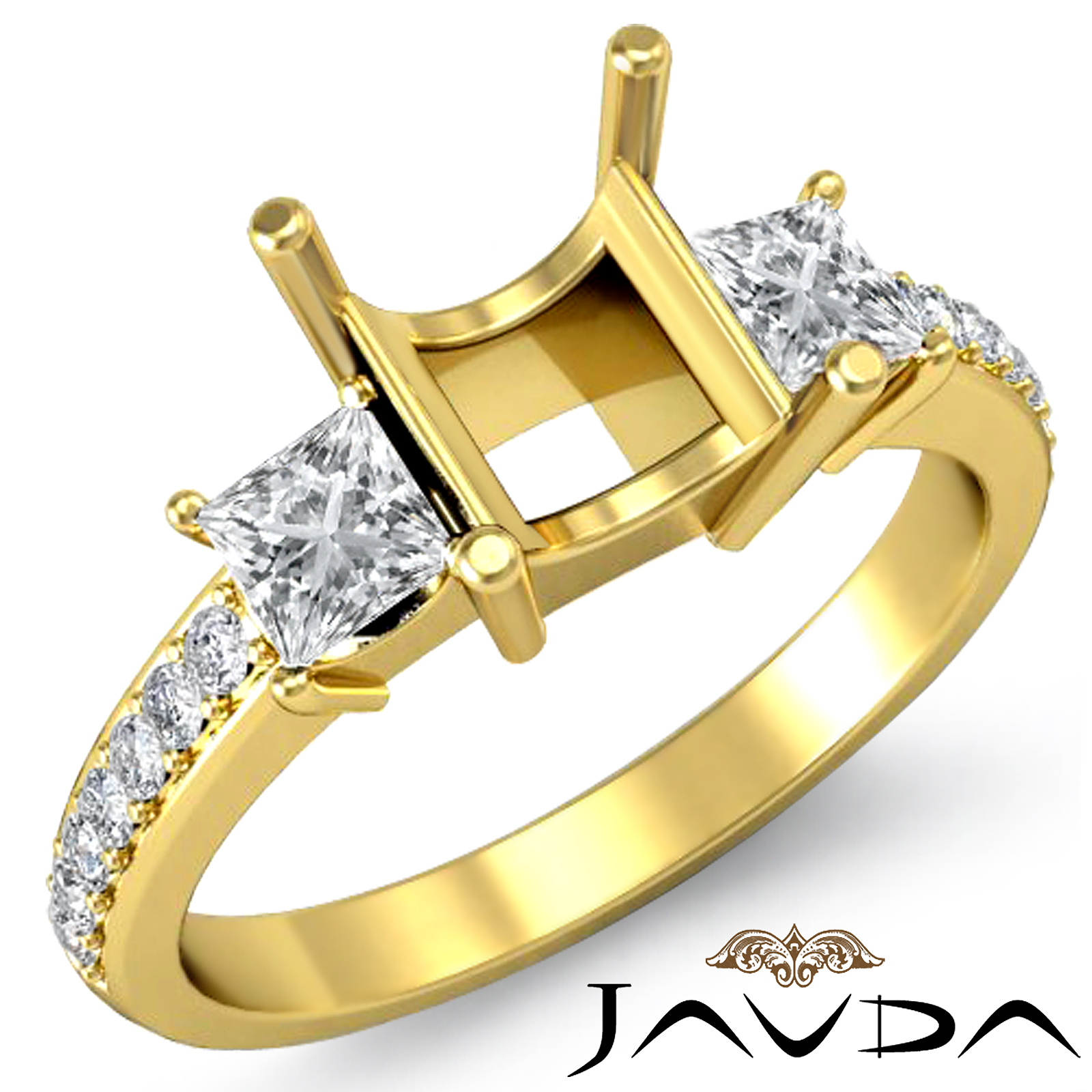 A glamorous 18k Gold Yellow semi mount princess cut center diamond sparkles in the front row, clustered by two princess side diamonds all in prong setting. Pave set round diamonds along the shank make for a spectacular ring. (0.81Ct. tw.)