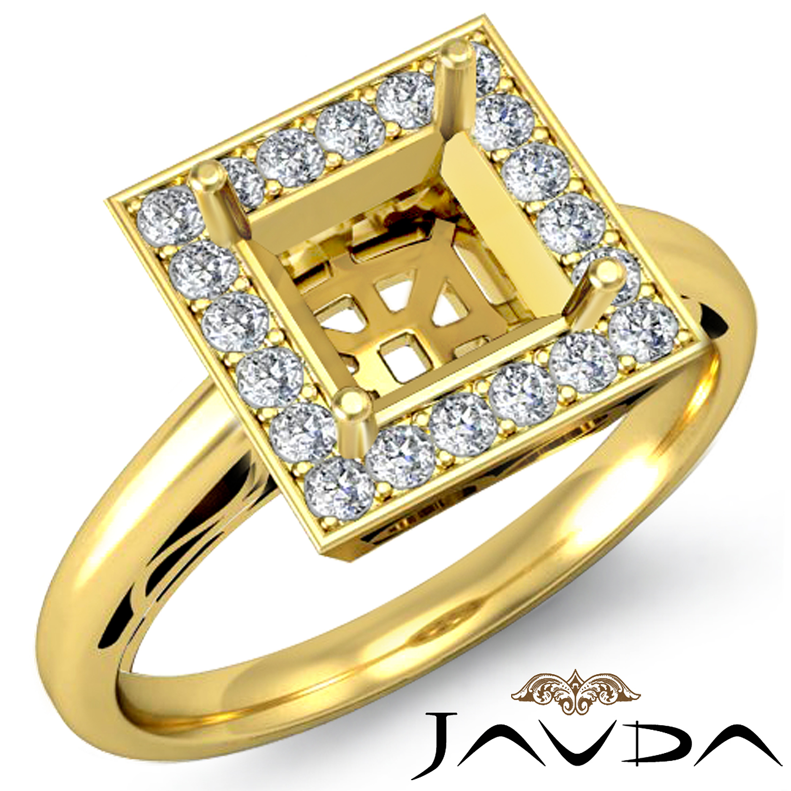 Undeniably striking, this princess semi mount diamond engagement ring is made in 18k Gold Yellow. It features round diamonds in pave setting on the beautiful halo. (0.36Ct. tw.)