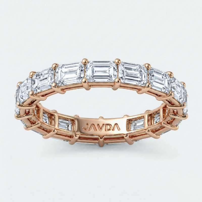 Presenting an endless ring of sparkle, emerald-cut HPHT lab-grown diamonds encircles in east-west configuration on an women's eternity band crafted 14k Rose Gold. This wedding band features emerald diamonds beautifully set in a shared prong setting. Also available in 14k & 18k white gold, yellow gold, rose gold and platinum 950. If you don't find your desired jewelry, please don't hesitate to contact our designer to make your custom jewelry design. (3.04Ct. tw.)