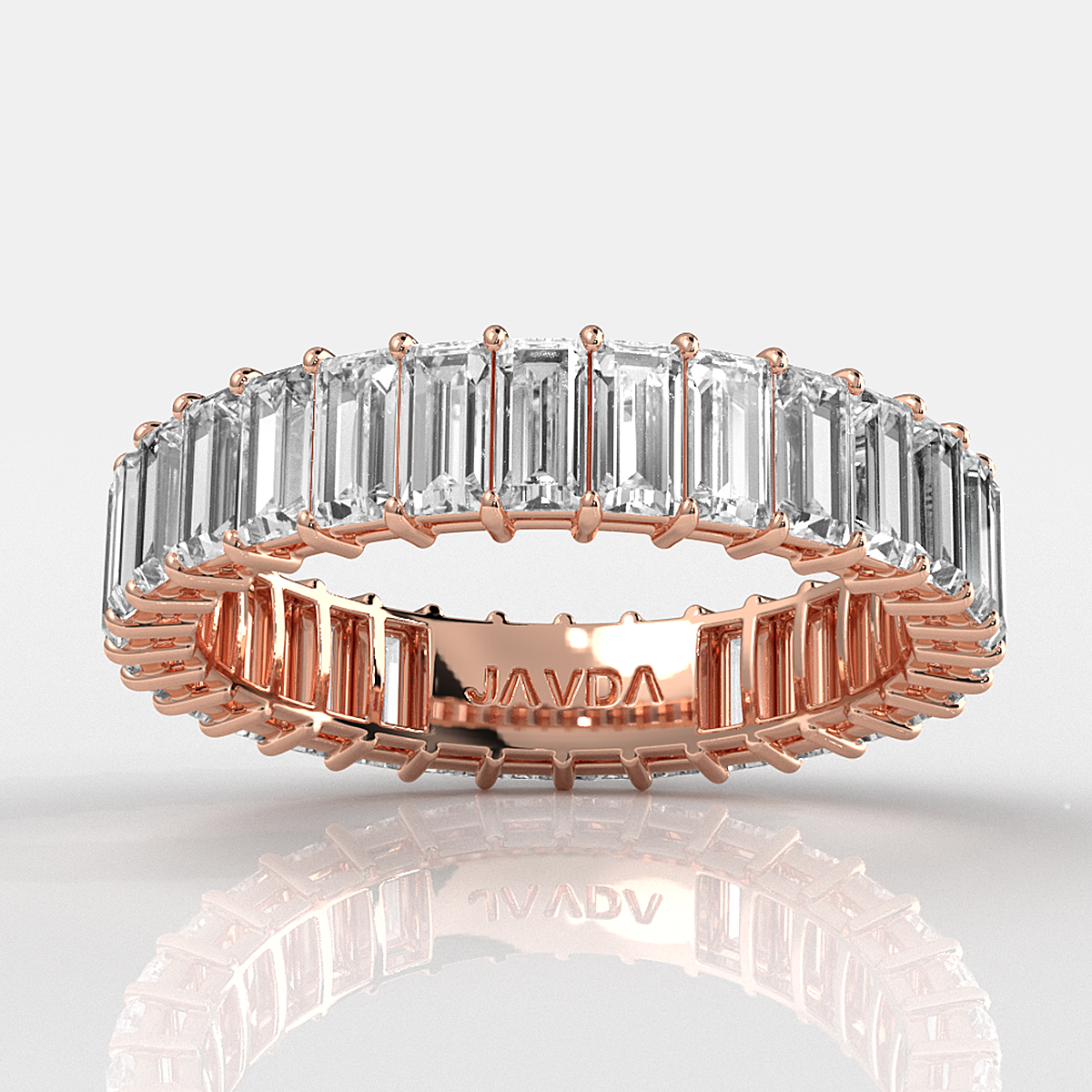 This breathtaking wedding band features 31 stone perfectly matched baguette HPHT lab-grown diamonds made 18k Rose Gold. This women's eternity ring showcases baguette in an shared prong setting . Also available in 14k & 18k white gold, yellow gold, rose gold and platinum 950. If you don't find your desired jewelry, please don't hesitate to contact our designer to make your custom jewelry design. (3.36Ct. tw.)