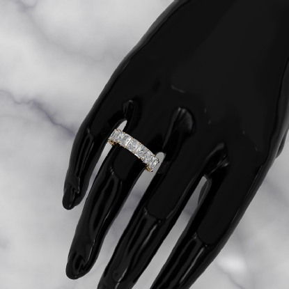 This incredible radiant cut HPHT lab-grown diamond eternity wedding band handcrafted 18k Gold Yellow. 17 stone radiant diamonds create a line of brilliance and are secured by shared prongs for extra sparkle showcases . Also available in 14k & 18k white gold, yellow gold, rose gold and platinum 950. If you don't find your desired jewelry, please don't hesitate to contact our designer to make your custom jewelry design. (7.56Ct. tw.)