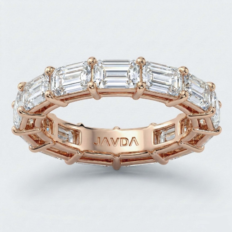 Encircling the finger with a shimmering emerald cut HPHT lab-grown diamond wedding band crafted 18k Rose Gold. This stunning eternity ring features sparkling emerald diamonds around the entire band in a classic, shared prong setting. Add a touch of elegance to any outfit, also available in 14k & 18k white gold, yellow gold, rose gold and platinum 950. If you don't find your desired jewelry, please don't hesitate to contact our designer to make your custom jewelry design (5.59Ct. tw.)