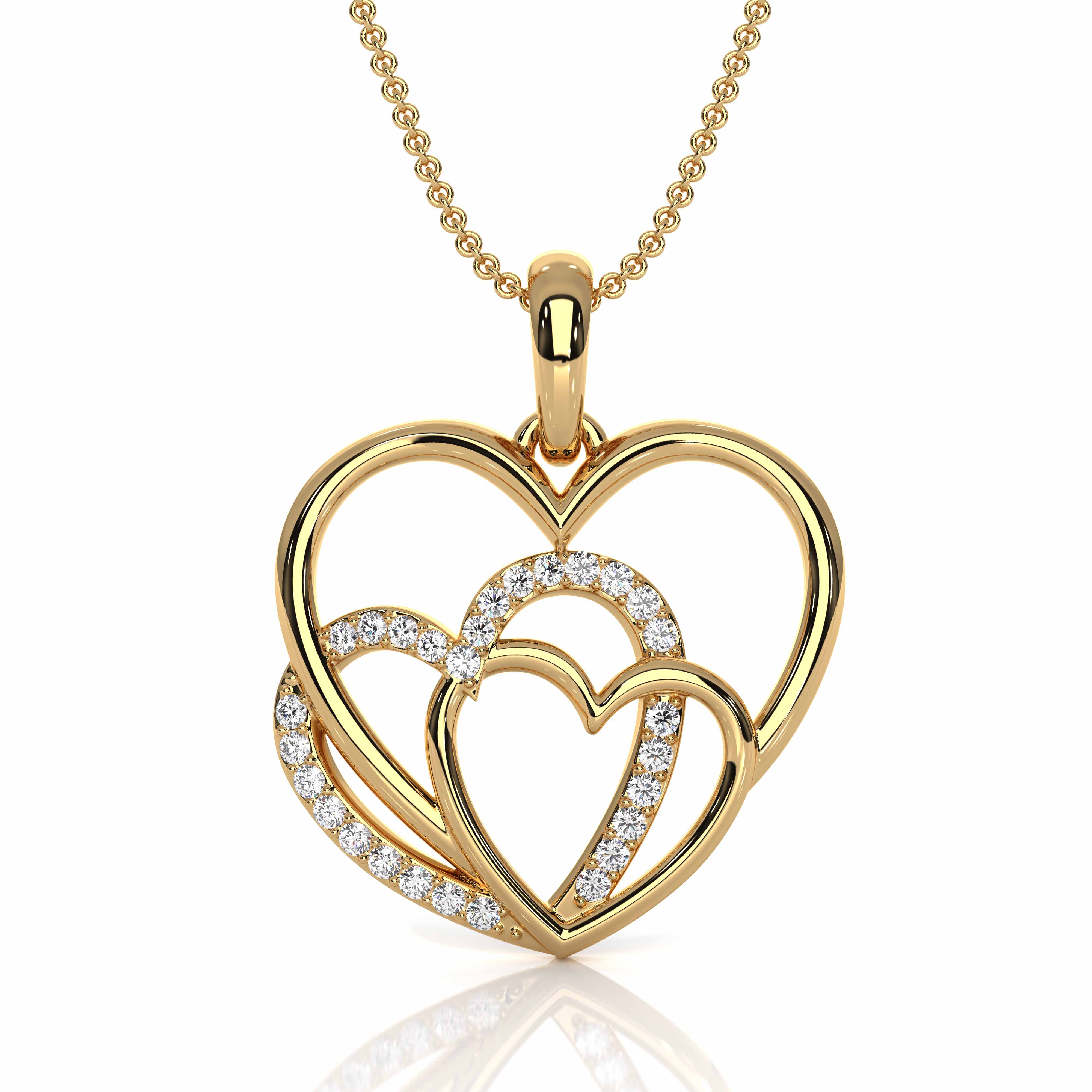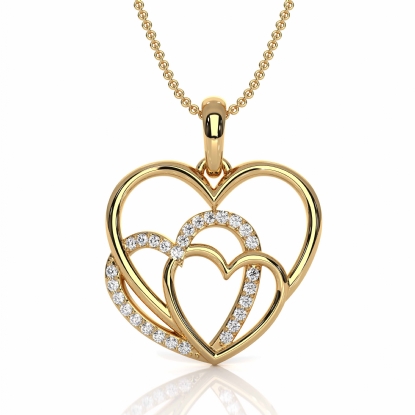This beautiful triple heart round diamond pendant necklace crafted in 14k Gold Yellow. This lovely pendant features a round lab grown diamonds in a micro pave setting. Express your love to your partner on this Valentine's Day, also available in 14k & 18k white gold, yellow gold, rose gold and platinum 950. If you don't find your desired jewelry, please don't hesitate to contact our designer to make your custom jewelry design. (0.13Ct. tw.)