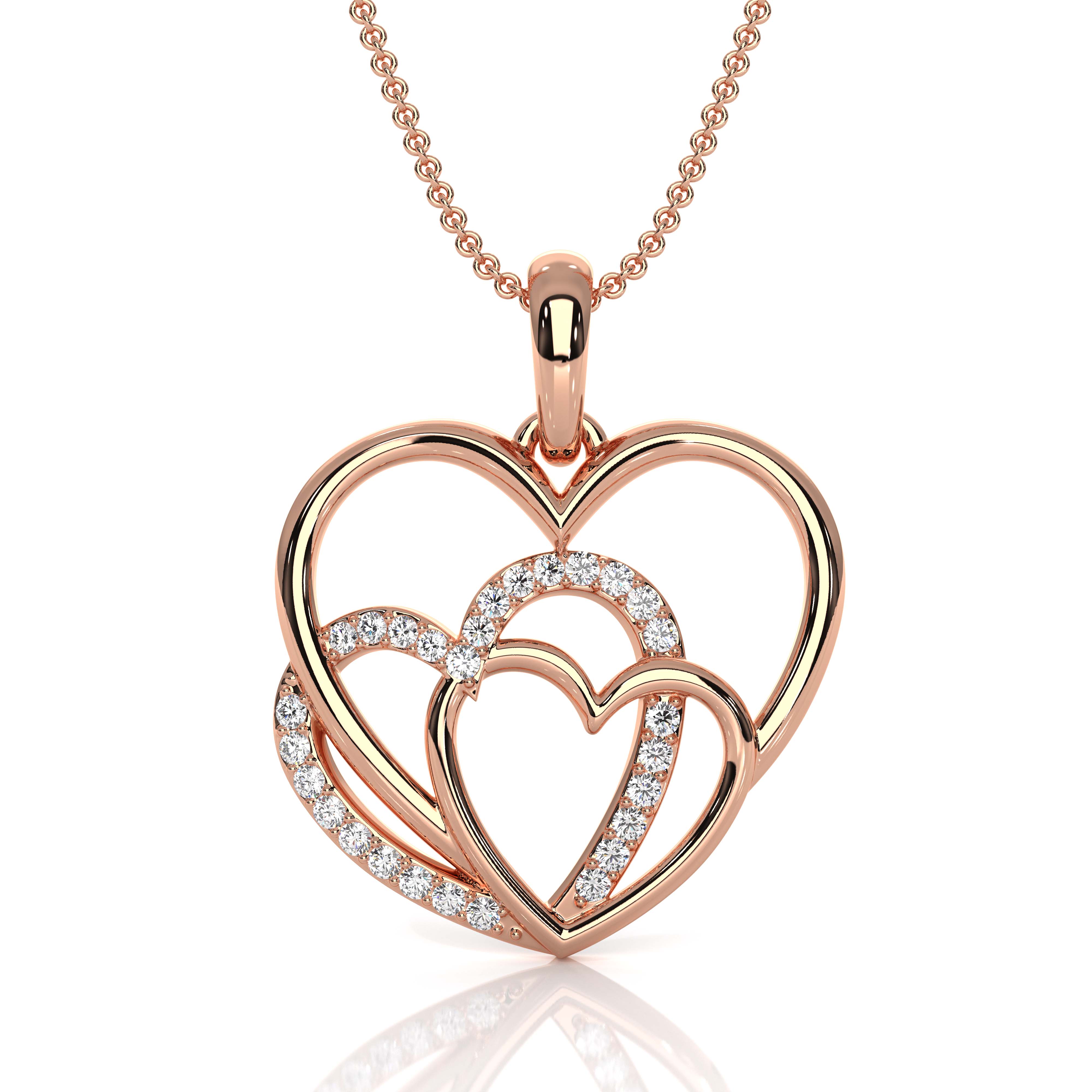 This beautiful triple heart round diamond pendant necklace crafted in 18k Rose Gold. This lovely pendant features a round lab grown diamonds in a micro pave setting. Express your love to your partner on this Valentine's Day, also available in 14k & 18k white gold, yellow gold, rose gold and platinum 950. If you don't find your desired jewelry, please don't hesitate to contact our designer to make your custom jewelry design. (0.13Ct. tw.)