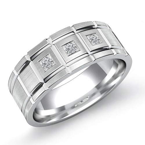 Stunning grooved diamond men's half wedding band is crafted in quality 14k Gold White. Showcasing matte finished vertical and horizontal grooved with princess cut diamonds in a bezel set.