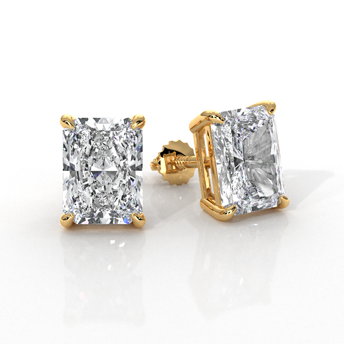 Breathtaking pair of claw prong basket style radiant lab grown diamond women's stud earrings crafted in 14k Gold Yellow, certified by IGI. This stunning stud earrings showcases a dazzling carat radiant diamond delicately secured with claw prongs. Also available in 14k & 18k white gold, yellow gold, rose gold and platinum 950. If you don't find your desired jewelry, please don't hesitate to contact our designer to make your custom jewelry designs. (4Ct. tw.)