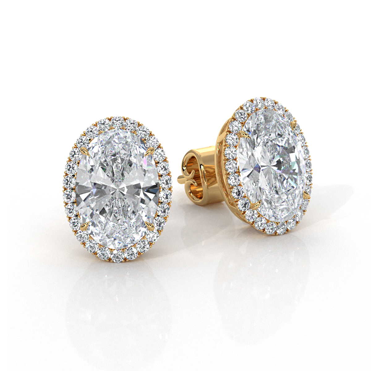 Classic pair of halo oval shape lab grown diamond basket style claw prong women's earrings meticulously crafted in 14k Gold Yellow, certified by IGI. Showcases a carat dazzling oval cut diamonds secured with claw prong. These earrings are a perfect choice for any occasion. Also available in 14k & 18k white gold, yellow gold, rose gold and platinum 950. If you don't find your desired jewelry, please don't hesitate to contact our designer to make your custom jewelry designs (3.26Ct. tw.)