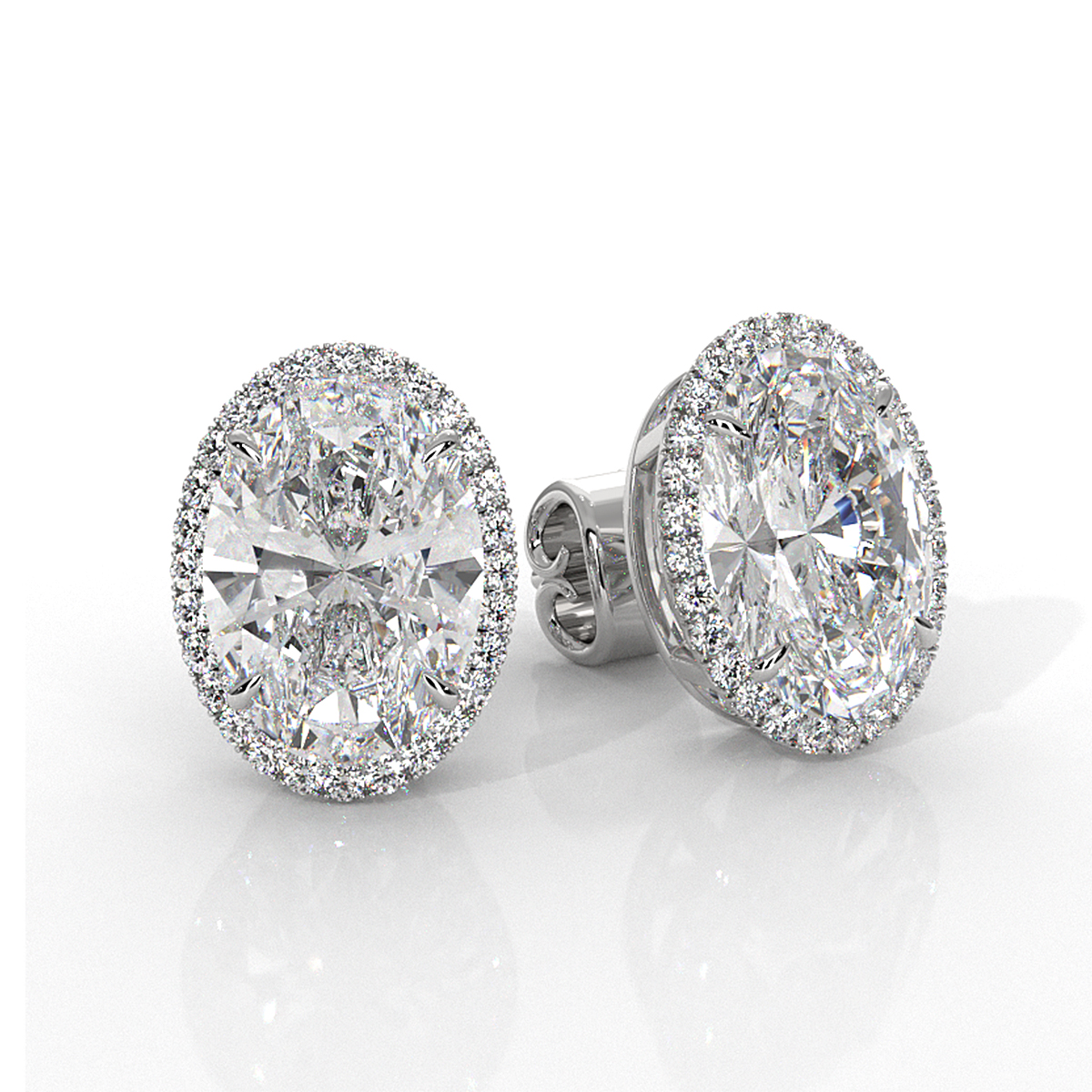 This beautiful and timeless pair of claw prong halo oval lab grown diamond women's earring made in 18k Gold White. Showcases carat oval diamonds IGI Certified secured with claw prong. Add a touch of elegance to any outfit, also available in 14k & 18k white gold, yellow gold, rose gold and platinum 950. If you don't find your desired jewelry, please don't hesitate to contact our designer to make your custom jewelry designs. (5.55Ct. tw.)