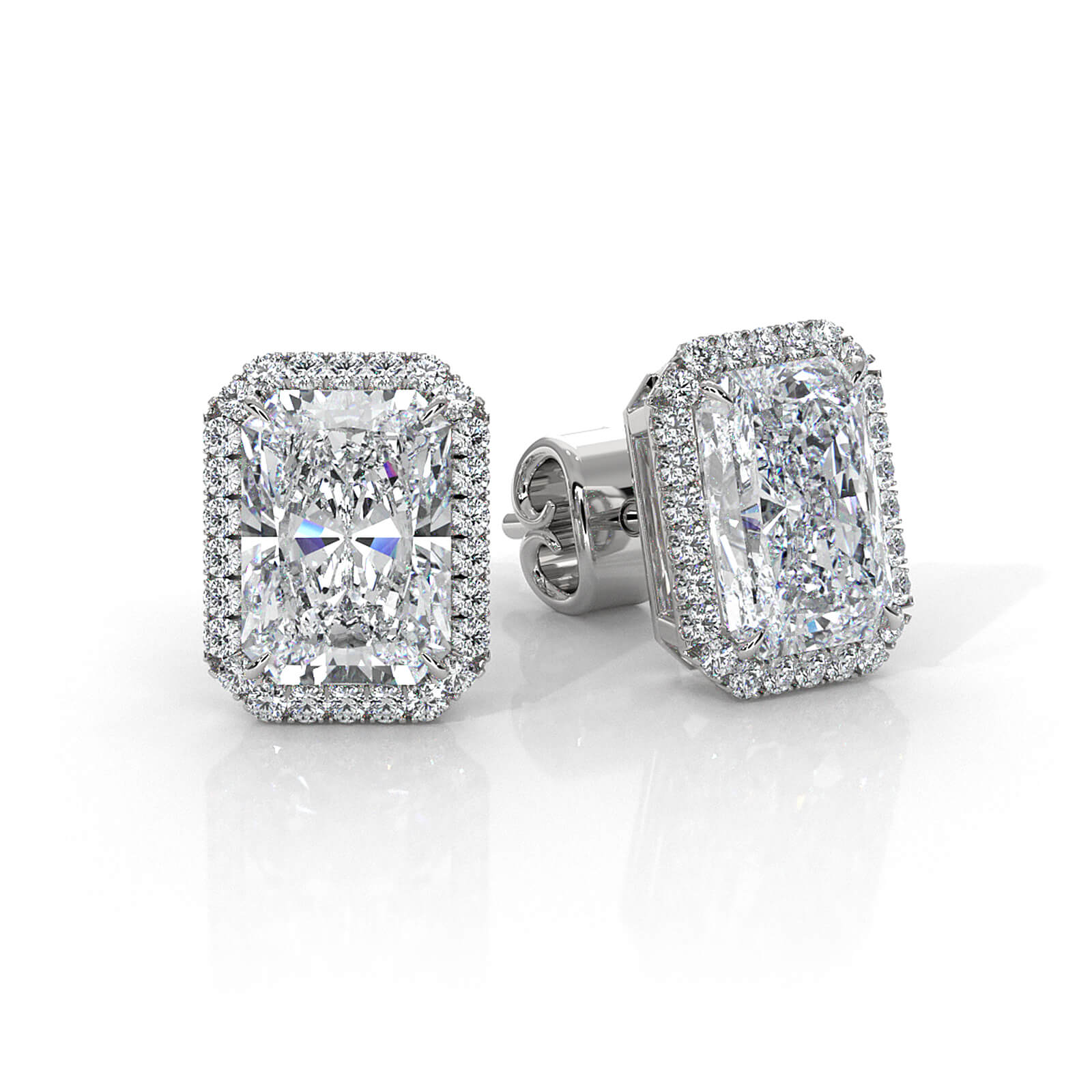 Simple and delicate women's claw prong halo radiant diamond basket style earrings crafted in high quality Platinum 950. Showcases carat radiant diamond in a claw prong setting and
